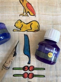 Découverte de l'Egypte ancienne et de son écriture si particulière, le hiéroglyphe. Expérimentation en atelier, au calame sur papyrus.