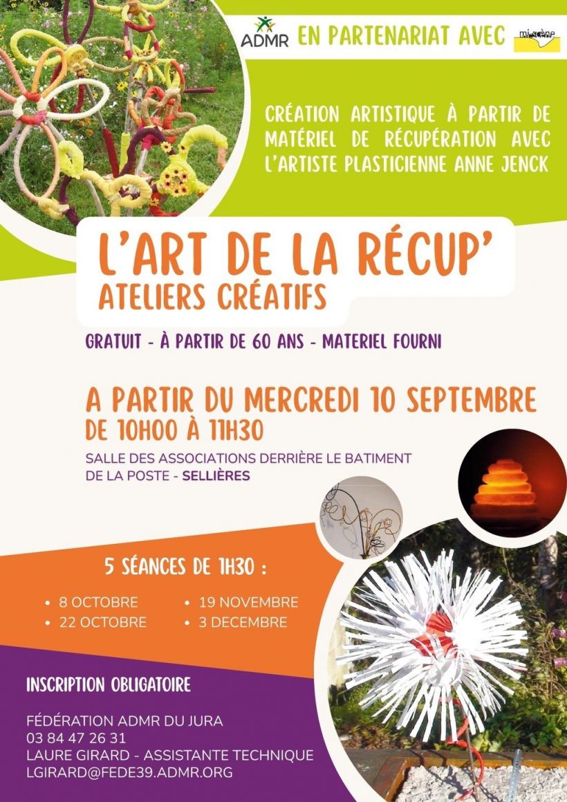 Après les ateliers musicaux de 2023, puis les ateliers d'écriture en 2024, ce sont pour cette année 2025, des ateliers autour de l'art plastique qui seront prochainement proposés par l'ADMR du Jura, et animés par Anne JENCK, artiste plasticienne !