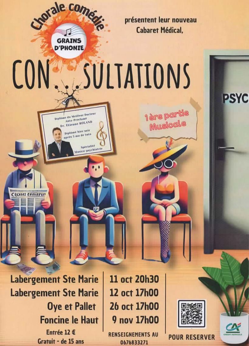 La Chorale "Les Grains d'Phonie" de Oye-et-Pallet sera en Concert-Comédie pour une consultation au Cabaret Médical de leur Chef "Musico-Psy" Etienne Roland, récemment diplômé. Un nouveau spectacle toujours aussi décalé, musical et dans la bonne humeur.