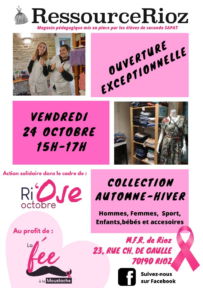 Vente solidaire à la RessourceRioz, dans le cadre d'octobre rose, de 15h à 17h.