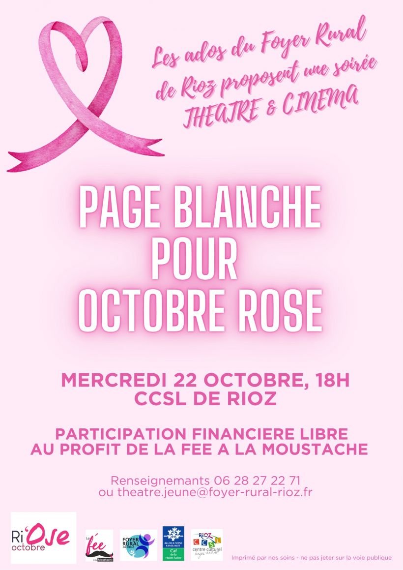 Soirée de restitution d'un grand projet mené par les ados de l'atelier théâtre du Foyer Rural de Rioz, qui comportera un spectacle sur la thématique d'octobre rose, et la diffusion de deux-court-métrages, l'un portant sur la création du spectacle et l'autre questionnant le plus bel âge de la vie.