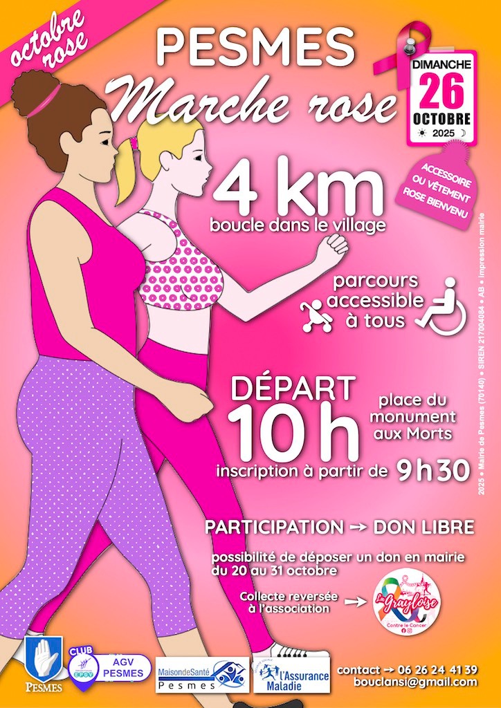 La Mairie de Pesmes ainsi que l'association AGV et la maison de santé de Pesmes vous invitent à une marche rose de 4km au profit de la Grayloise.