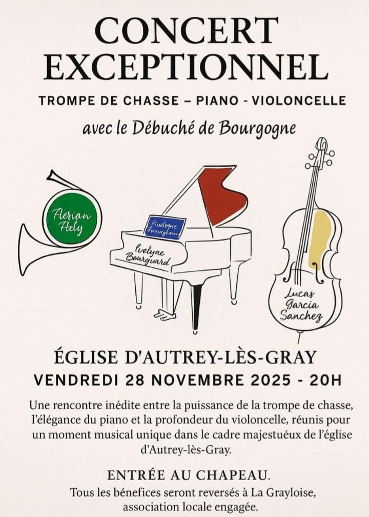 Une rencontre inédite entre la puissance de la trompe de chasse, l'élégance du piano et la profondeur du violoncelle, réunis pour un moment musical unique dans le cadre majestueux de l'Église d'Autrey-Lès-Gray.