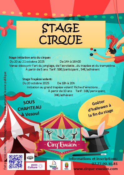 Stage initiation arts du cirque au cirque Evasion de Vesoul : venez découvrir l'arts du jonglage, de l'acrobatie... du trapèze et du trampoline... profitez d'un petit goûter d'halloween à la fin du stage.