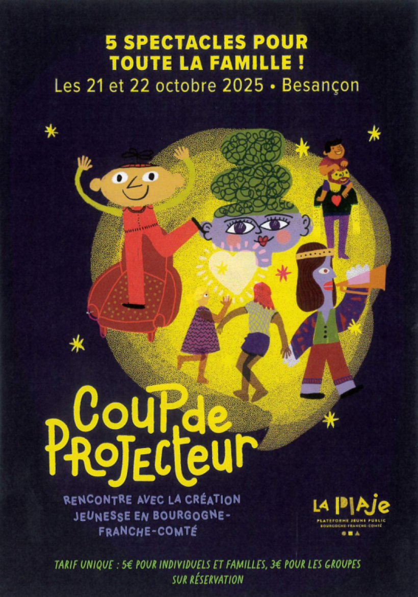 Dans le cadre de Coup de Projecteur, 5 spectacles de la région et un atelier participatif et gratuit imaginé par Nouvelles Formes! Le réseau professionnel la PlaJe, défend les spectacles adressés à la jeunesse. Tous les ans, nous proposons à tout.e.s, à tout âge, de découvrir les créations d'équipes artistiques de Bourgogne-Franche-Comté. es spectacles sont ouverts à tout.e.s, sur réservation. En raison des places limitées, merci de réserver.