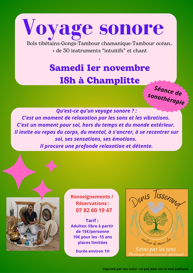 Embarquez pour un voyage sonore lors d'une séance de sonothérapie. Apaisement et relaxation au son de bols tibétains, gong, tambour chamanique, tambour océan… Tarif libre à partir de 15€/ adulte, 10€/ pour les moins de 15 ans. Sur réservation.