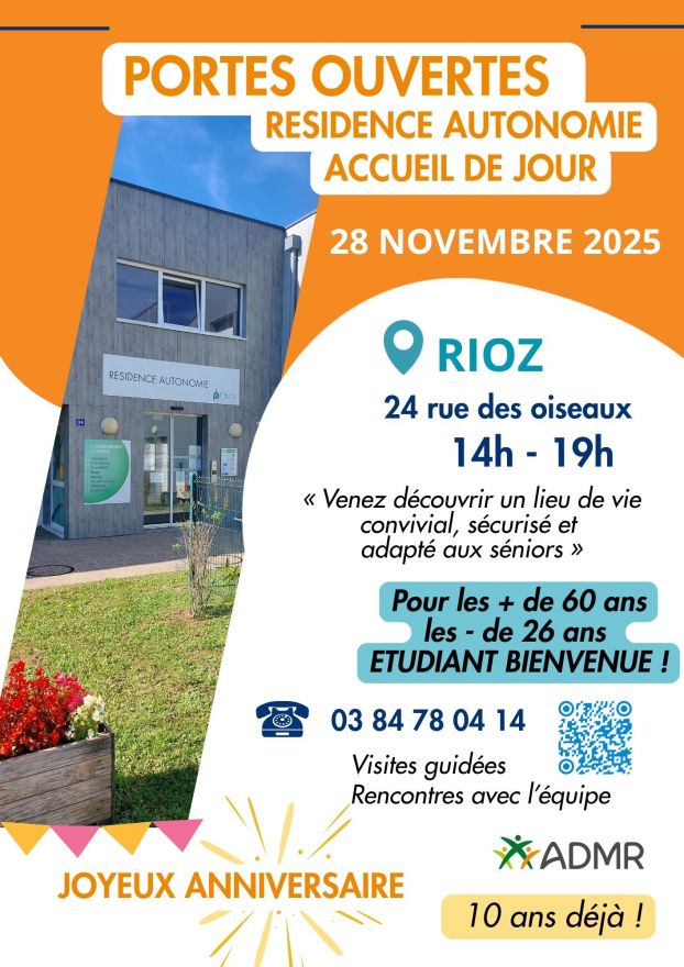 L'ADMR organise de 14h à 18h des Portes Ouvertes à la Résidence Autonomie et à l'Accueil de Jour de RIOZ à l'occasion de leurs 10 ans !