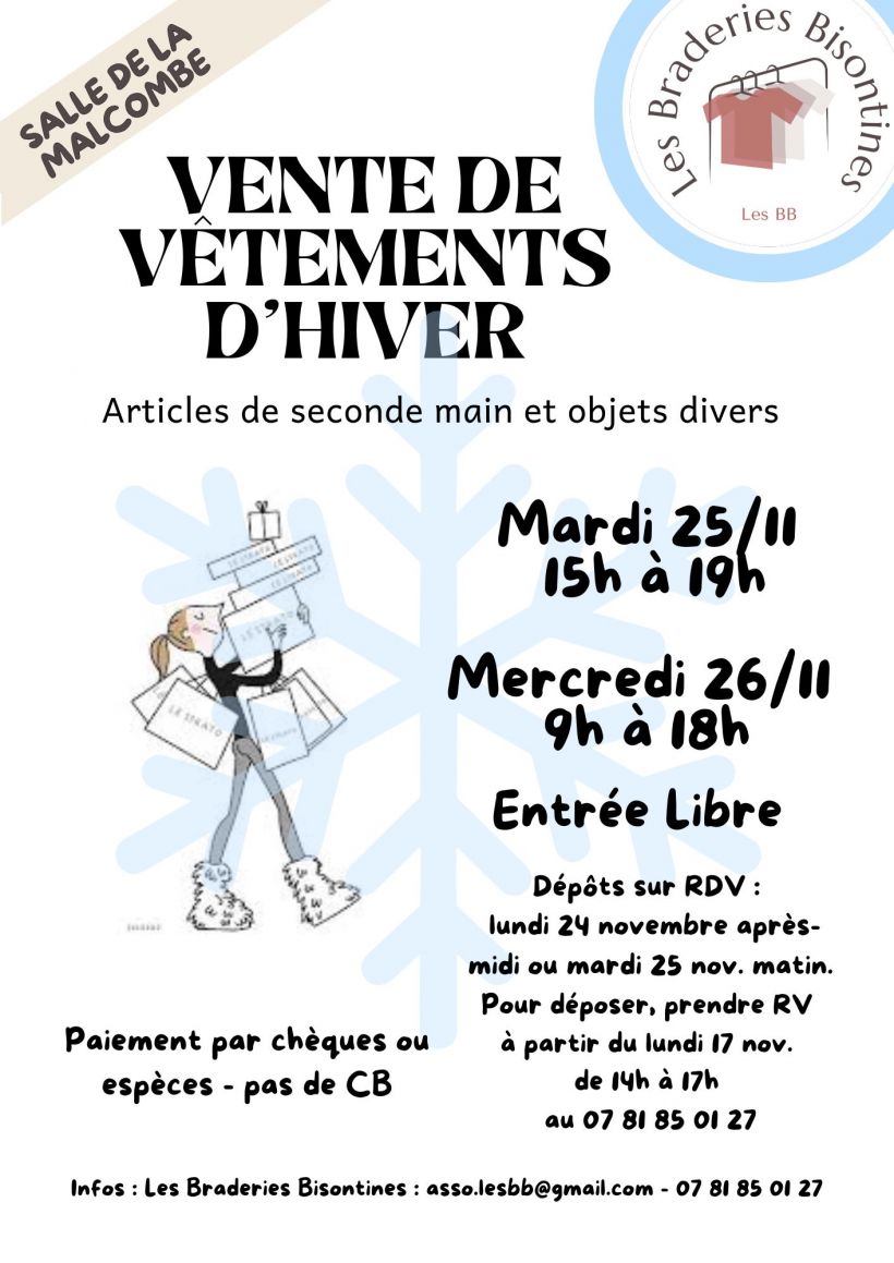 Vente de vêtements d'hiver (homme, femme, enfant, linge de maison, sacs, chaussures, manteaux) et objets divers (bijoux, vaisselle, déco de Noël) de seconde main.