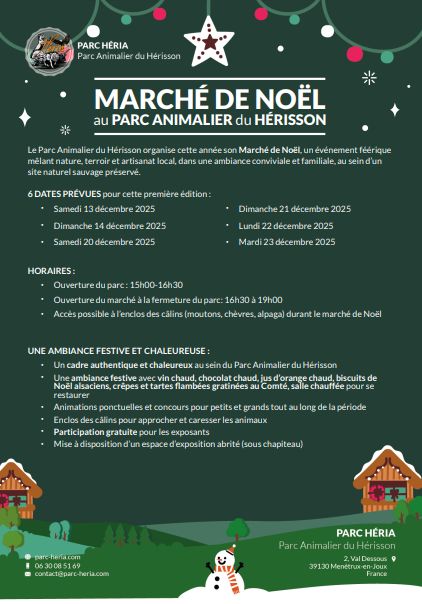 Le Parc Animalier du Hérisson organise cette année son Marché de Noël, un événement féerique mêlant nature, terroir et artisanat local, dans une ambiance conviviale et familiale, au sein d'un site naturel sauvage préservé.