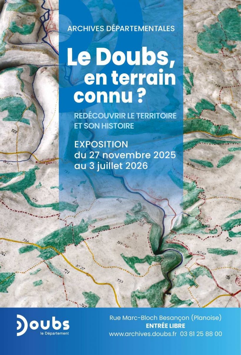 Avec ses 8 m² de plâtre brut, le plan-relief du Doubs réalisé en 1877 attire l'oeil d'entrée : moyennes montagnes, plateaux et vallées se dessinent en trois dimensions au centre de l'exposition. Autour de lui, une centaine de documents - cartes, plans, registres, photographies - composent Le Doubs, en terrain connu ? illustrant le territoire et son histoire.