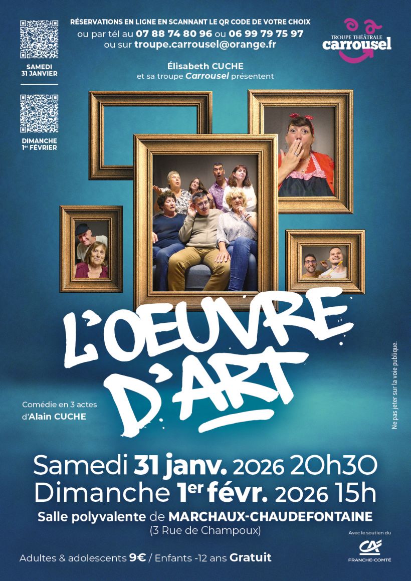 Dans « L'OEUVRE D'ART », nouvelle comédie en trois actes de la Troupe Théâtrale CARROUSEL, le talentueux artiste des mots Alain CUCHE a troqué sa plume toujours légère et drôle contre un pinceau pour étaler et (dé)peindre sur sa toile, les différentes couleurs et facettes de la nature humaine, de la plus honnête à la plus vénale. Il en ressort une oeuvre que Gustave COURBET lui-même n'aurait certainement pas reniée et qui a toute sa place au Louvre... Quoique !