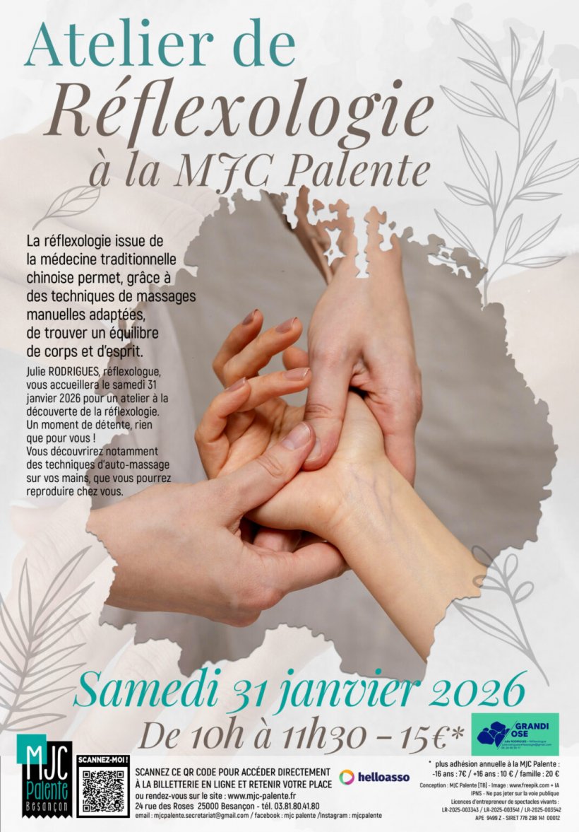 Julie RODRIGUES, réflexologue vous accueillera le samedi 31 janvier 2026 pour un atelier à la découverte de la réflexologie. Un moment de détente, rien que pour vous ! Vous découvrirez notamment des techniques d’auto-massage sur vos mains, que vous pourrez reproduire chez vous.