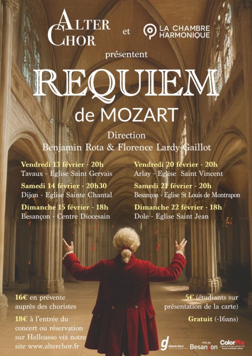 Comme chaque année depuis 2017, Alter Chor, choeur amateur régional dirigé par Florence Lardy-Gaillot, présente un nouveau programme de musique sacrée et le produit dans 6 lieux différents de Bourgogne-Franche Comté. Il sera accompagné par l'orchestre de Benjamin Rota, la Chambre Harmonique. Venez écouter cette musique vibrante d'émotion chantée par 90 choristes accompagnés par 20 musiciens professionnels.