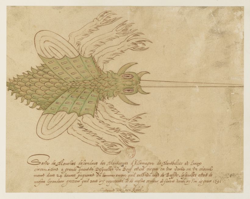Un dessin de Jean II Rabel, peintre, graveur et éditeur à succès sous les derniers Valois, montre une étrange mouche. Une inscription indique qu'il s'agit d'une espèce venue de Montbéliard. Observation naturaliste ou prodige à interpréter, alors que Montbéliard, qui accueille de nombreux exilés protestants français, a été attaquée par les Guise en 1587-88 ? Nous mènerons l'enquête.