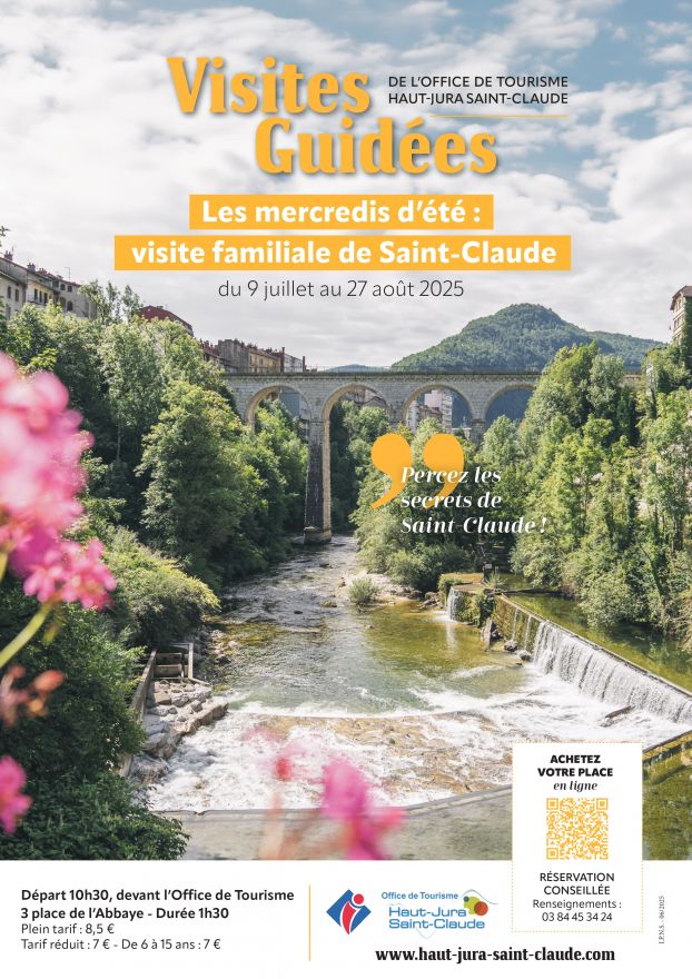 Vous avez envie de connaître tous les secrets la capitale du Haut-Jura ? Profitez de cette occasion unique pour suivre une visite guidée familiale où vous découvrirez de nombreux lieux incontournables de la ville de Saint-Claude : ses bâtiments, ses places et ses rues qui font que cette ville de moyenne montagne est devenue la capitale de la pipe et le diamant !