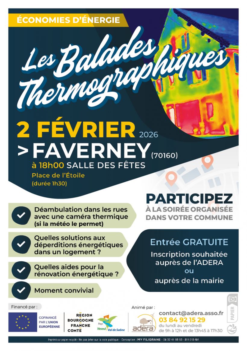 Balade sous la forme d'une déambulation (si les conditions météo le permettent) dans la rue avec un conseiller de l'ADERA équipé d'une caméra thermique. Les défauts constatés, les solutions à apporter et les aides financières à la rénovation seront abordés.