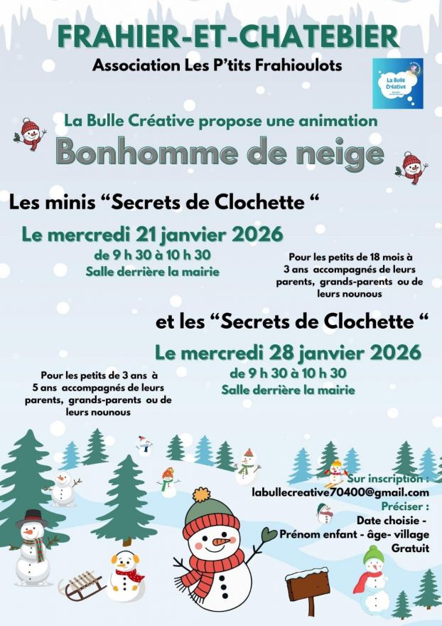 Atelier "Bonhomme de neige" avec la Bulle Créative et Les Petits Frahioulots, les mercredis 21 et 28 janvier de 9h30 à 10h30, dans la salle derrière la mairie de Frahier-et-Chatebier. Atelier suivi d'un goûter.