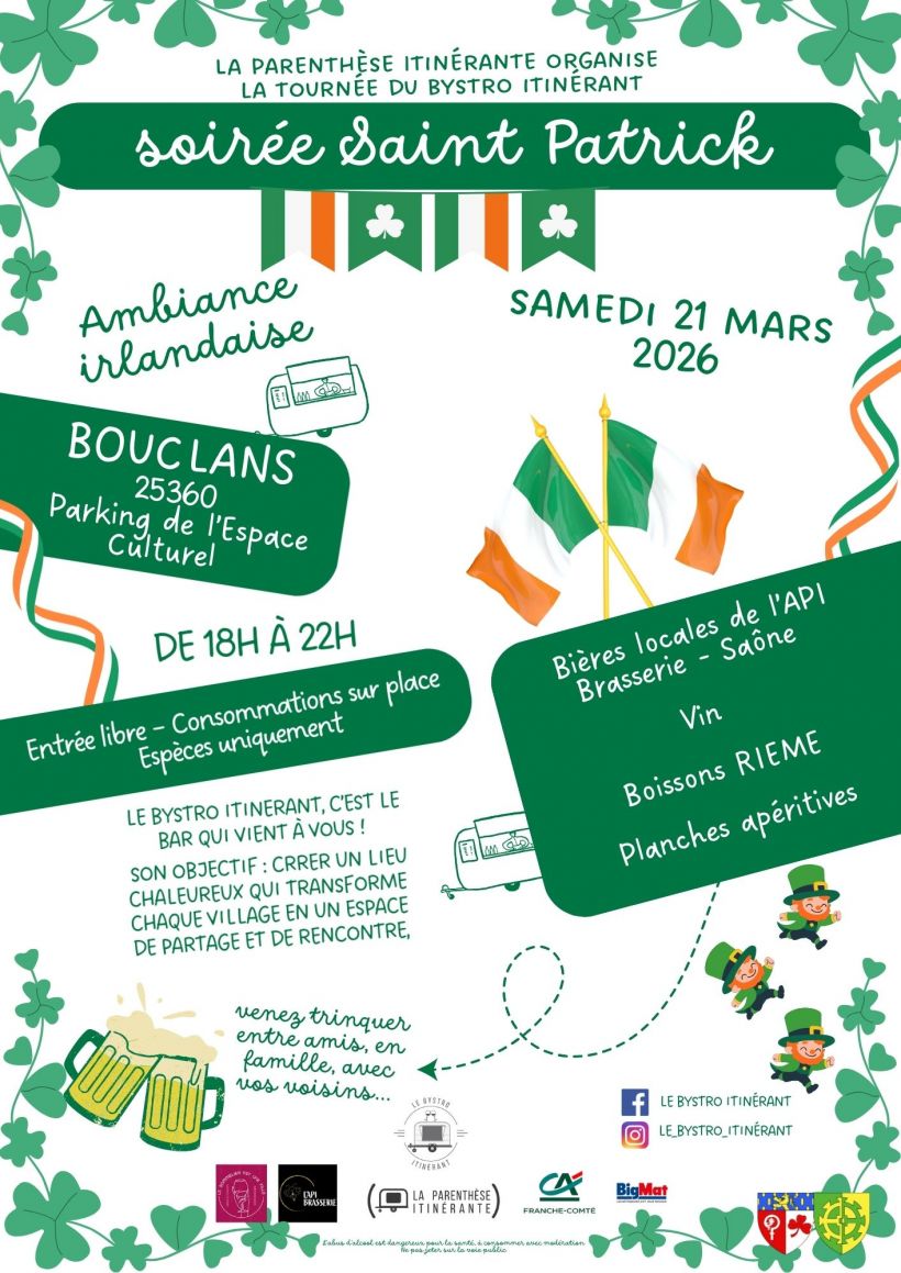 Le Bystro Itinérant pose ses verres à Bouclans pour une soirée placée sous le signe de la convivialité et de la bonne humeur à l'occasion de la Saint-Patrick.
