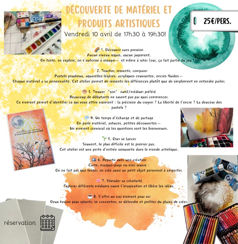 Chaque atelier est conçu pour stimuler l'imagination, développer la créativité et encourager l'expression personnelle, tout en s'adaptant aux niveaux de chacun. Les participants sont guidés pas à pas et repartent avec leurs propres créations uniques.