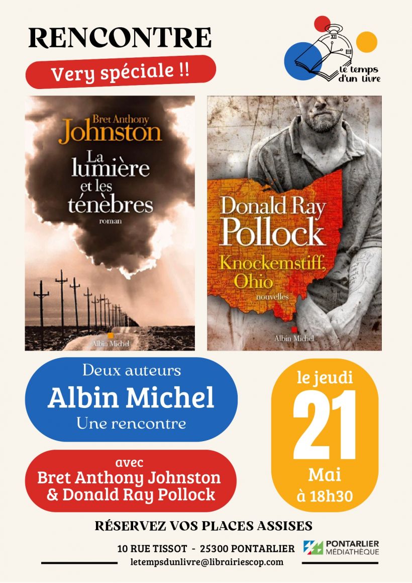Rencontrez deux Grands Auteurs de la collection Terres d'Amérique (Albin Michel), qui fêtera ses 30 ans au festival America cet automne : Bret Anthony Johnston et Donald Ray Pollock ! Ils viendront notamment présenter leurs derniers livres "La lumière et les Ténèbres" et "Knoockemstiff, Ohio".
