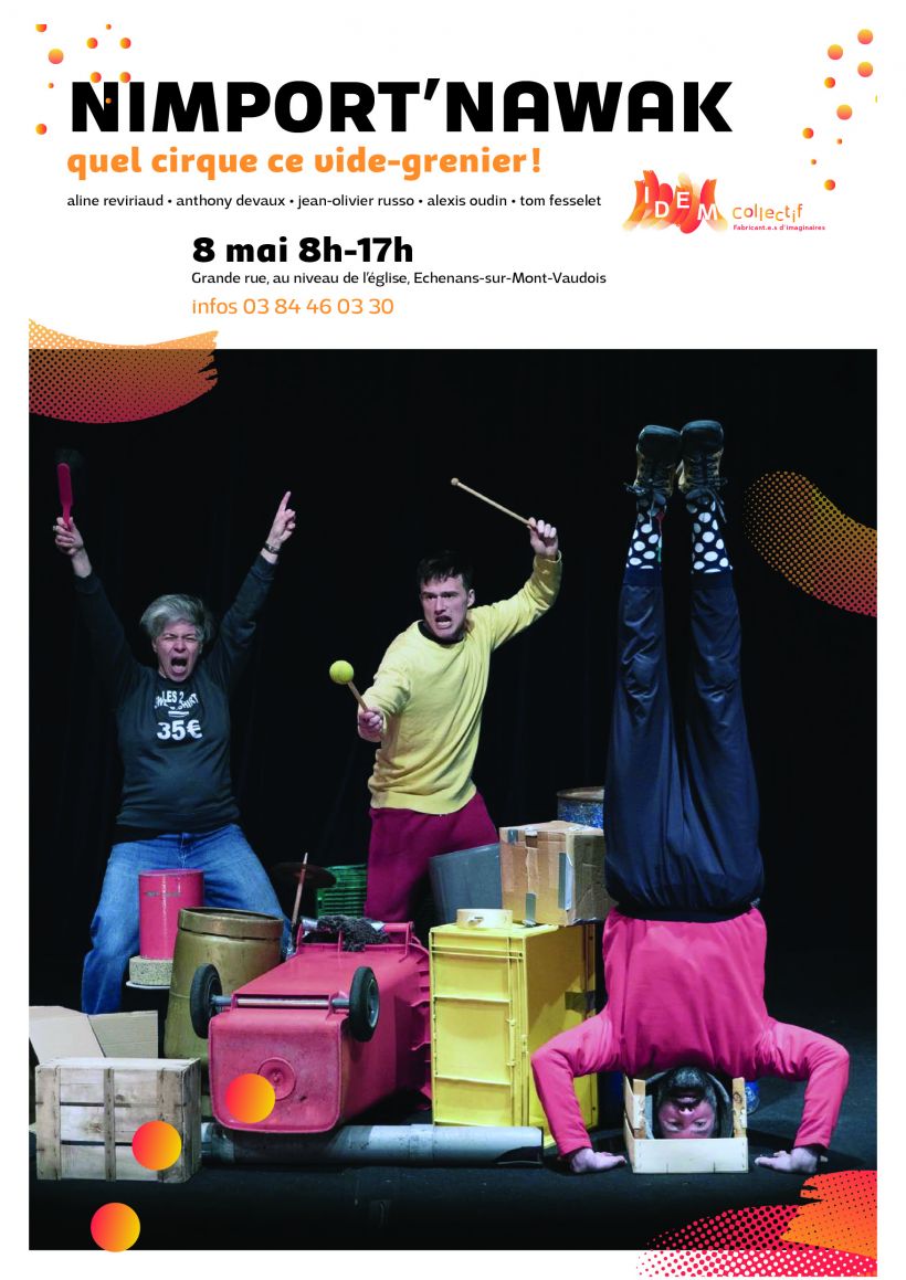 Dans le cadre du Contrat Territorial de Développement Culturel (CTDC), retrouvez les comédiens d'Idem Collectif et les artistes de l'Odyssée du cirque au vide grenier d'Echenans-sous-Mont-Vaudois pour une journée pas comme les autres !