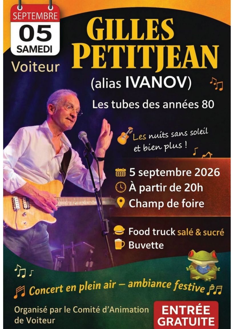Soirée animée par Gilles Petitjean, ancien membre du groupe Ivanov, connu pour le tube "Les nuits sans soleil". Une soirée dansante en plein air, pleine de souvenirs et de bonne humeur en perspective.