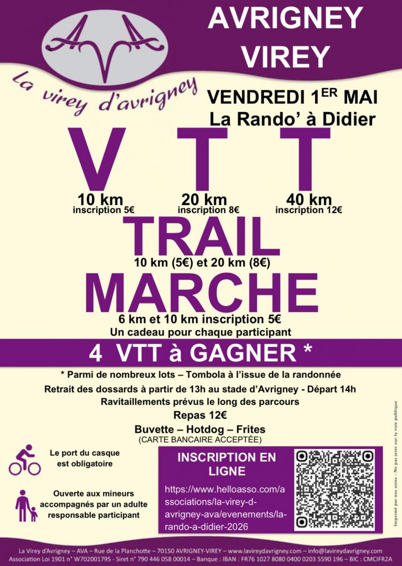 Comme chaque année, l'association AVA d'Avrigney-Virey organise des randonnées. Au programme des randos VTT de 10, 20 et 40 kms. Des trails de 10 et 20 kms et des marches de 6 et 10 kms.
