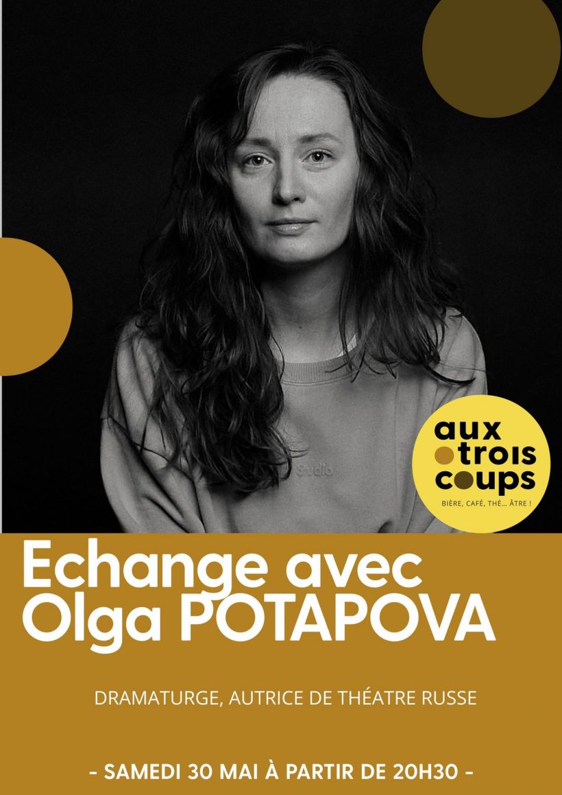 Venez découvrir et échanger avec Olga Potapova Aux Trois Coups. Dramaturge et autrice Russe de théâtre, Olga explore les liens entre nature, mémoire et arts performatifs. À travers ses pièces et projets interdisciplinaires, elle questionne l'identité, les frontières entre réel et imaginaire, et notre relation au vivant.