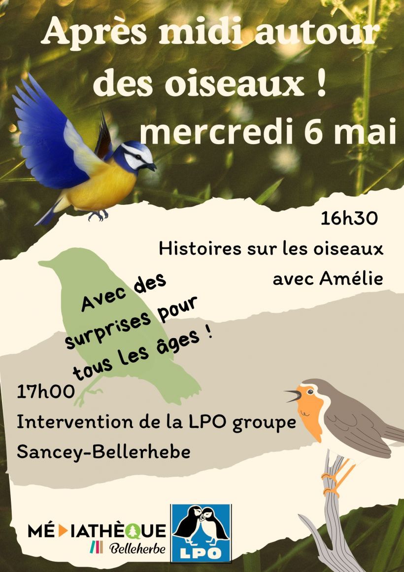 Retrouvez des animations pour les enfants le mercredi 6 mai, avec des histoires à partir de 16h30, suivi par une intervention de la LPO branche Sancey-Belleherbe à 17h. Plein de surprises vous attendent, pour petits et grands !