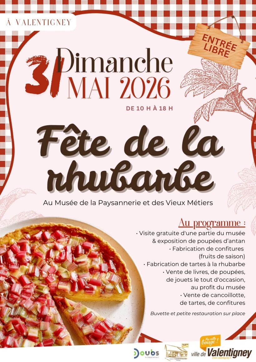 Dans la cour du Musée, vente de confitures de rhubarbe et de cancoillotte, cuisson de tartes à la rhubarbe dans le four à bois. Visite partielle du Musée et de l'exposition Poupées d'Antan. Buvette et petite restauration.