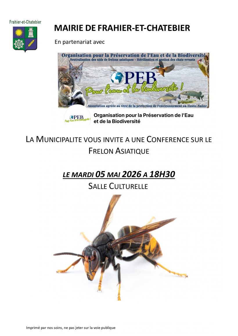 La commune de Frahier-et-Chatebier, en partenariat avec l'OPEB, organise une conférence sur le frelon asiatique.