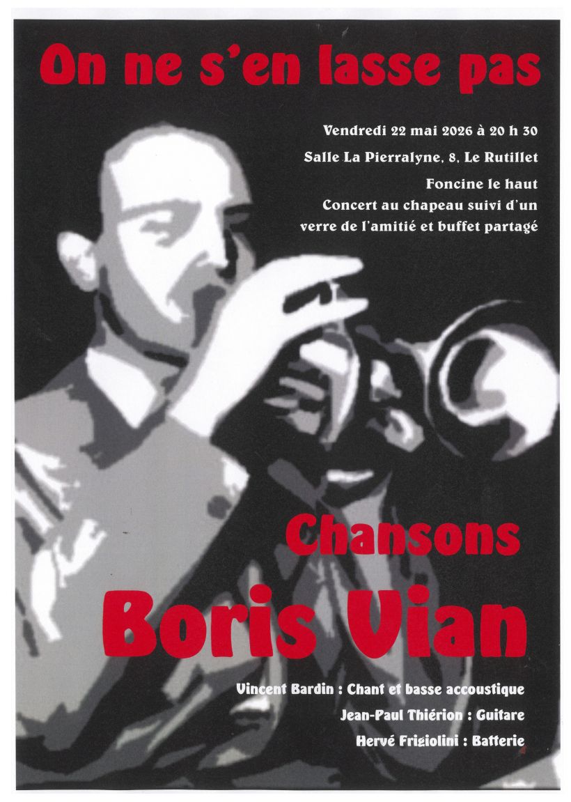 Récital Boris Vian, concert au chapeau suivi d'un verre de l'amitié et buffet partagé.