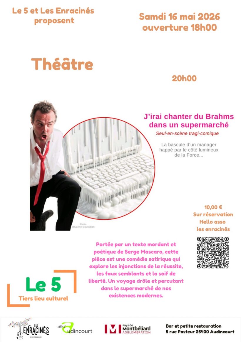 Théatre : Portée par un texte mordant et poétique de Serge Mascaro, cette pièce est une comédie satirique qui explore les injonctions de la réussite, les faux-semblants, et la soif de liberté enfouie en chacun de nous. Un voyage drôle, émouvant et percutant dans le supermarché de nos existences modernes.