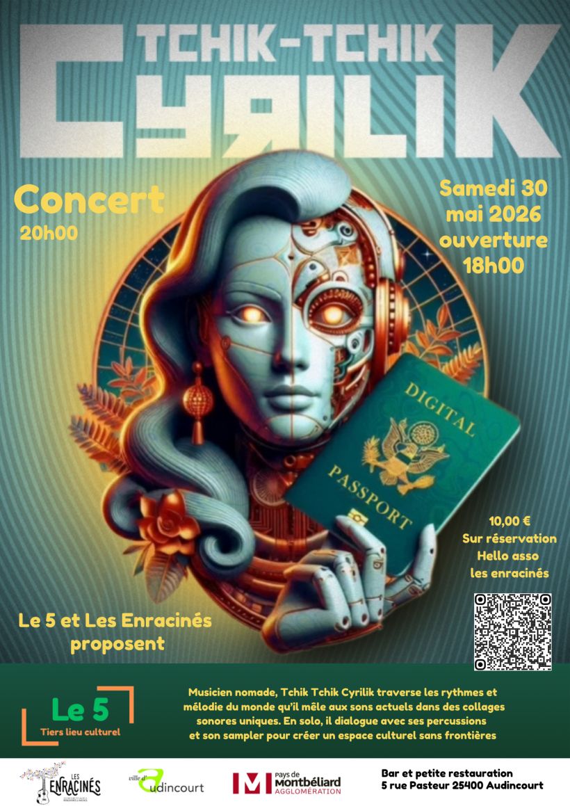 Musicien nomade, Tchik Tchik Cyrilik traverse les rythmes et mélodies du monde, des Balkans à l'Amérique latine, qu'il mêle aux sons actuels dans des collages sonores uniques. En solo, il dialogue avec ses percussions et son sampler pour créer un espace culturel sans frontières, vibrant et partagé. Son troisième album, Digital Passport, prolonge ce voyage avec un métissage musical brûlant, oscillant entre drum & bass, hip-hop, ska ou rock.