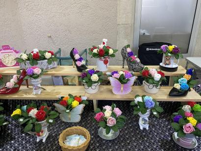 Je réalise des compositions florales avec des fleurs de savon dans différents contenants et des contenants en papier et des mugs sublimés que je réalise moi même.